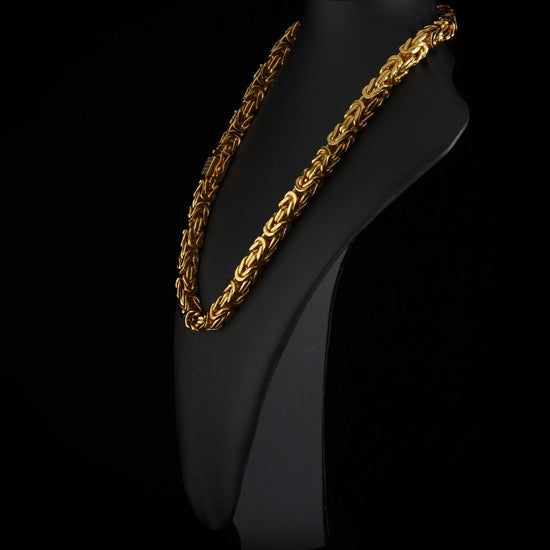 Handmade Byzantine chain solidly made in the durable metal brass coated with an 18K PVD Gold Plating, Swedish gold. It has a casket lock either with or without diamonds (CZ stones).